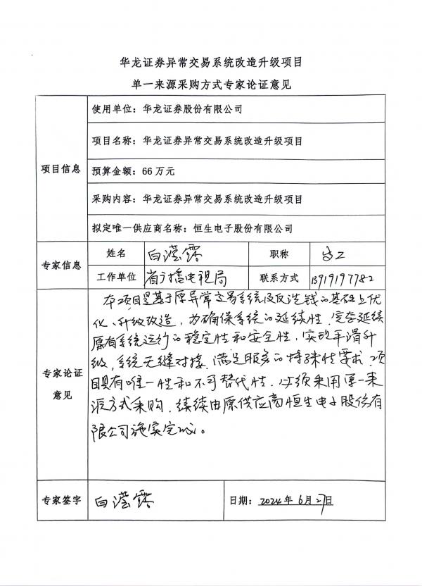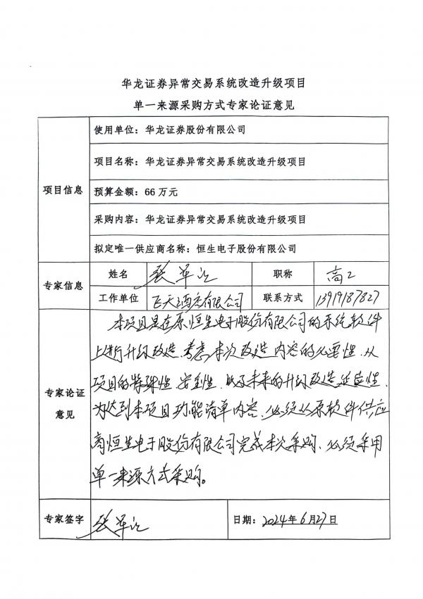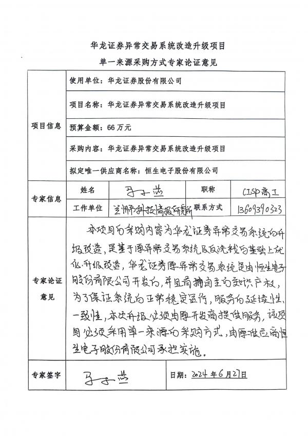 根據(jù)以上特點,我公司擬以單一來源方式采購恒生電子股份有限公司開發(fā)的異常交易系統(tǒng)、反洗錢系統(tǒng)監(jiān)管改造的功能模塊產品,包含程序化交易風險監(jiān)控、異常交易專業(yè)版涉及加強程序化交易管理改造、異常交易涉及可轉債退市整理期改造、異常交易證券組支持公募REITs改造、異常交易支持統(tǒng)一認證、反洗錢系統(tǒng)支持統(tǒng)一認證,以進一步完善、提升華龍證券合規(guī)管理體系的建設。