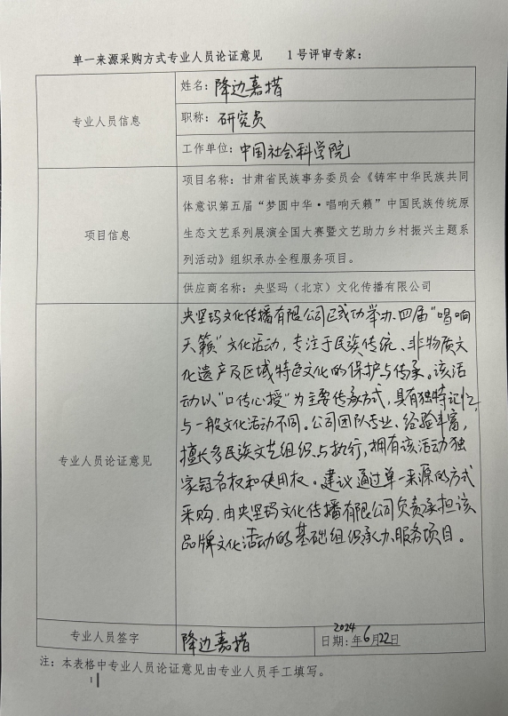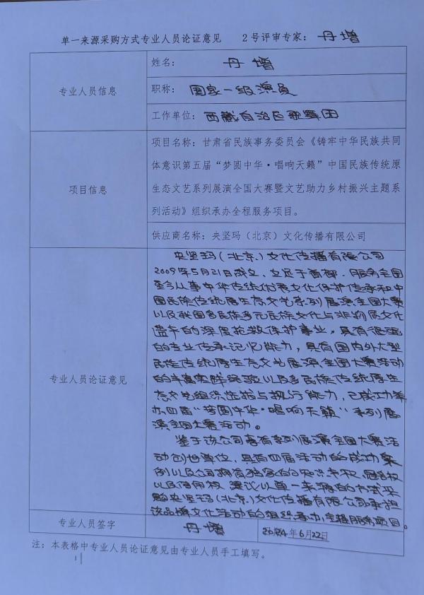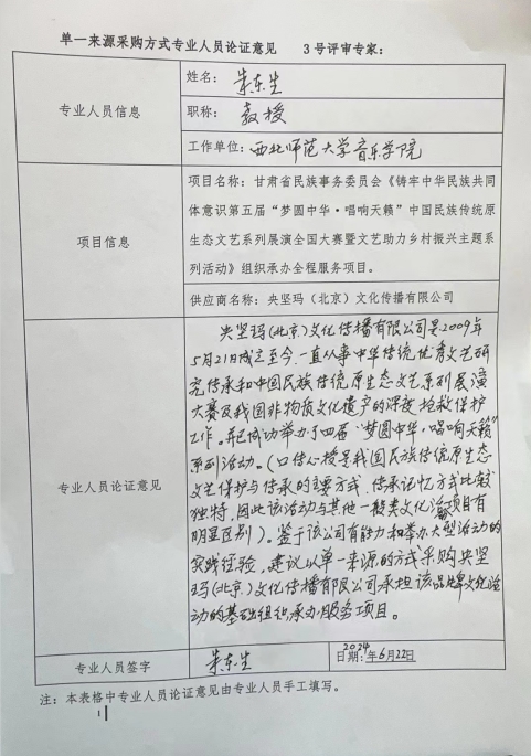 央堅(jiān)瑪(北京)文化傳播有限公司2009年5月21日成立,立足首都,服務(wù)全國(guó),主要從事中華傳統(tǒng)優(yōu)秀文化保護(hù)傳承和中國(guó)民族傳統(tǒng)原生態(tài)文藝系列展演全國(guó)大賽以及我國(guó)多民族多元民族文化與非物質(zhì)文化遺產(chǎn)的深度搶救保護(hù)事業(yè),具有很強(qiáng)的專(zhuān)業(yè)和能力,具有國(guó)內(nèi)外大型民族傳統(tǒng)原生態(tài)文藝展演全國(guó)大賽活動(dòng)的豐富實(shí)踐經(jīng)驗(yàn)以及多民族傳統(tǒng)原生態(tài)文藝組織選拔與執(zhí)行能力,已成功舉辦四屆“夢(mèng)圓中華·唱響天籟”系列展演全國(guó)大賽活動(dòng)。鑒于該公司為系列展演全國(guó)大賽活動(dòng)始創(chuàng)單位,具有四屆活動(dòng)的成功案例以及公司擁有獨(dú)家的知識(shí)產(chǎn)權(quán)、冠名權(quán)以及使用權(quán),建議以單一來(lái)源的方式采購(gòu)央堅(jiān)瑪(北京)文化傳播有限公司承擔(dān)該品牌文化活動(dòng)的組織承辦全程服務(wù)項(xiàng)目。