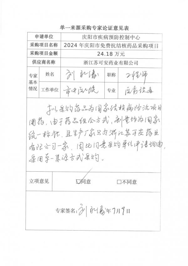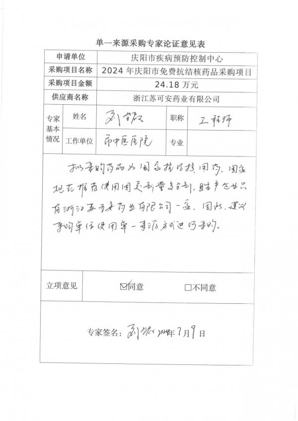 ?四、實(shí)施單一來源采購的簡要理由:按照《2024年中央補(bǔ)助地方甘肅省結(jié)核病防治項(xiàng)目實(shí)施方案》要求,免費(fèi)抗結(jié)核藥品由市州級疾控中心統(tǒng)一采購,國家規(guī)范推薦且全省統(tǒng)一要求使用固定劑量復(fù)合劑(FDC),目前全省使用的FDC乙胺吡嗪利福異煙片(HRZE四聯(lián)組合,含H37.5mg、R75mg、Z200mg、E137.5mg)和FDC異福膠囊(HR二聯(lián)組合,含H150mg、R300mg),全國僅有浙江蘇可安藥業(yè)有限公司一家企業(yè)生產(chǎn)。目前我市免費(fèi)抗結(jié)核藥品庫存只能滿足至2024年6月底的供應(yīng),如不能及時(shí)采購到位,將影響國家為患者提供免費(fèi)抗結(jié)核藥品政策的落實(shí)。現(xiàn)申請單一來源從杭州蘇可安藥業(yè)有限公司采購。