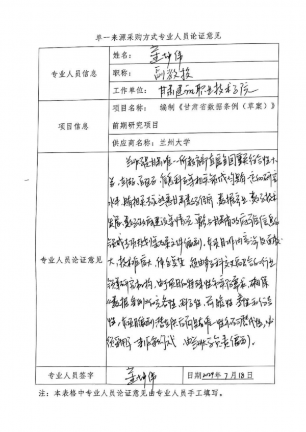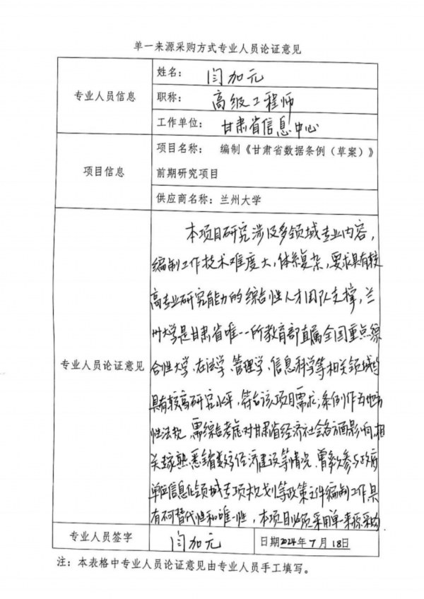 采用單一來(lái)源采購(gòu)方式的原因及說(shuō)明:一是項(xiàng)目研究涉及多領(lǐng)域問(wèn)題,需具有較高專業(yè)研究能力的綜合性人才團(tuán)隊(duì)支撐。蘭州大學(xué)是我省唯一一所教育部直屬全國(guó)重點(diǎn)綜合性大學(xué),在法學(xué)、管理學(xué)、信息科學(xué)等相關(guān)領(lǐng)域均具有一定的研究水平,符合該特殊需求。二是條例作為地方性法規(guī),需綜合考慮對(duì)甘肅省經(jīng)濟(jì)社會(huì)各方面影響和需求。蘭州大學(xué)長(zhǎng)期扎根甘肅,在服務(wù)國(guó)家戰(zhàn)略和地方經(jīng)濟(jì)社會(huì)發(fā)展中發(fā)揮著重要作用,相關(guān)專家熟悉全省數(shù)字經(jīng)濟(jì)、數(shù)據(jù)產(chǎn)業(yè)、數(shù)字技術(shù)發(fā)展、數(shù)字政府建設(shè)等情況,曾參與政府單位信息化領(lǐng)域?qū)m?xiàng)規(guī)劃等政策文件編制,具備相應(yīng)工作實(shí)績(jī)。三是項(xiàng)目需要在本地經(jīng)常性開(kāi)展走訪調(diào)研,委托省內(nèi)研究機(jī)構(gòu)參與有利于節(jié)約成本、保證工作質(zhì)量。