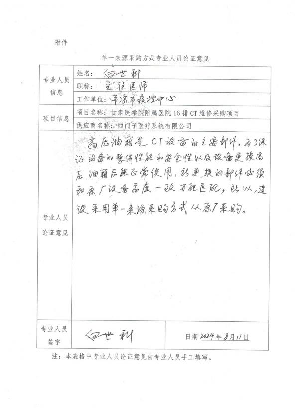采用單一來源采購方式的原因及說明:1.高壓油箱是CT設(shè)備的主要部件,需要與CT設(shè)備高度匹配,需保證設(shè)備的整體性、安全性、穩(wěn)定性。2.該設(shè)備除原廠外無其他廠家可提供,為保證臨床檢查結(jié)果的可靠性和設(shè)備的整體正常運(yùn)行。3.綜上所述,西門子醫(yī)療系統(tǒng)有限公司為本項(xiàng)目的唯一供應(yīng)商,擬采用單一來源方式采購。