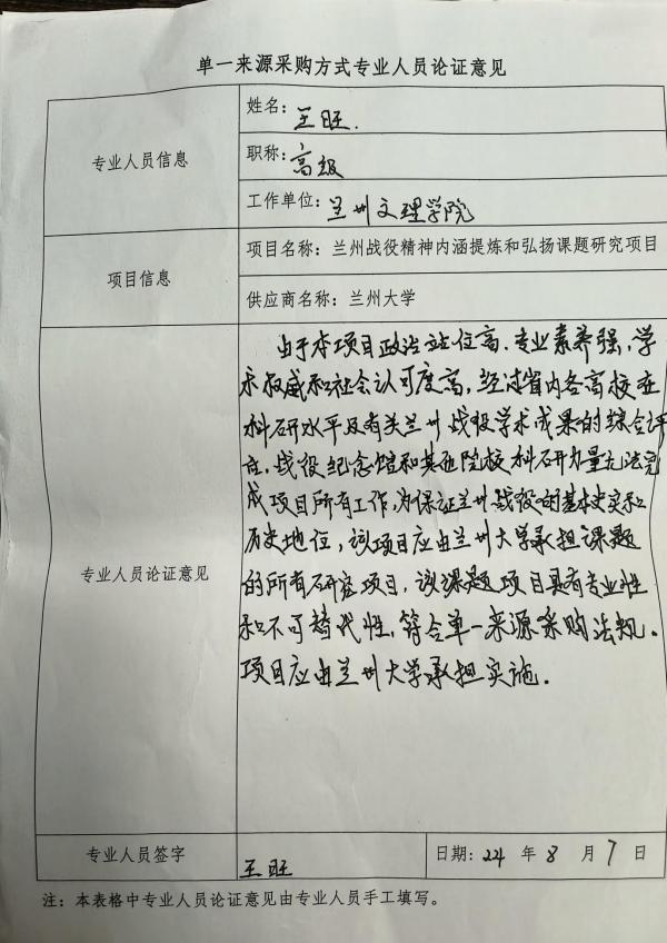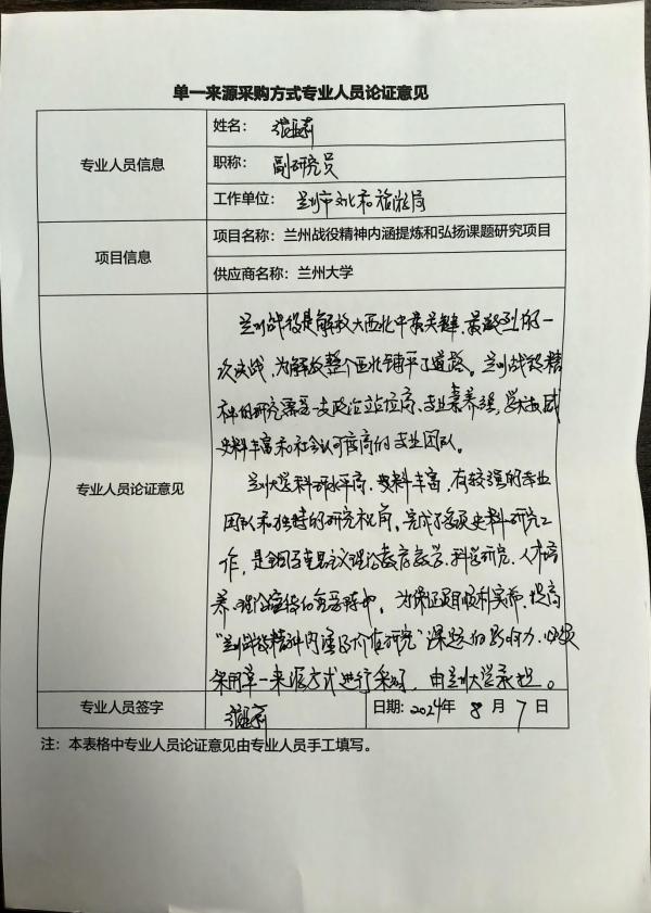 (2)由于本項(xiàng)目政治站位高,專業(yè)素養(yǎng)強(qiáng),學(xué)術(shù)權(quán)威和社會(huì)認(rèn)可度高,經(jīng)過省內(nèi)各高校在科研水平及有關(guān)蘭州戰(zhàn)役學(xué)術(shù)成果的綜合評(píng)估,戰(zhàn)役紀(jì)念館和其他院??蒲辛α繜o法完成項(xiàng)目所有工作,為保證蘭州戰(zhàn)役的基本史實(shí)和歷史地位,該項(xiàng)目應(yīng)由蘭州大學(xué)承擔(dān)課題的所有研究項(xiàng)目,該課題項(xiàng)目具有專業(yè)性和不可替代性,符合單一來源采購法規(guī),項(xiàng)目應(yīng)由蘭州大學(xué)承擔(dān)實(shí)施。