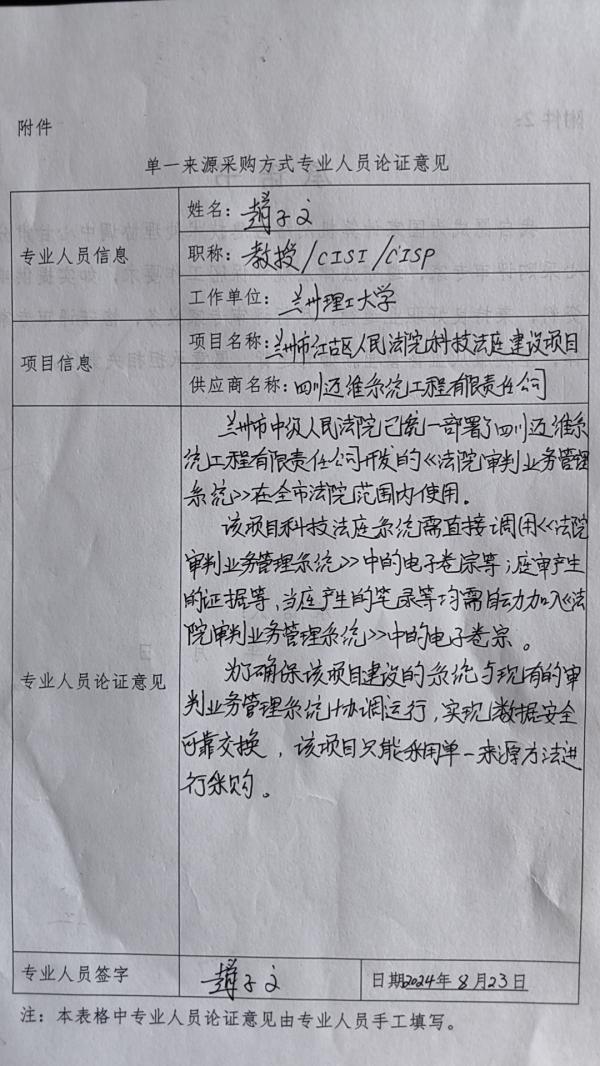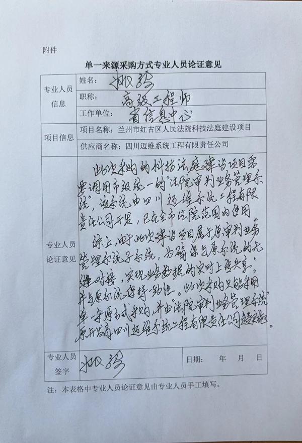 采用單一來源采購方式的原因及說明:按照蘭州市中級人民法院的統(tǒng)一部署,四川邁維系統(tǒng)工程有限責任公司開發(fā)的《法院審判業(yè)務管理系統(tǒng)》已在全市法院范圍內(nèi)使用,科技法庭系統(tǒng)為《法院審判業(yè)務管理系統(tǒng)》的子系統(tǒng),為確保整個系統(tǒng)的協(xié)調(diào)運行,實現(xiàn)我院審判業(yè)務管理系統(tǒng)及各子系統(tǒng)的數(shù)據(jù)交換,根據(jù)《中華人民共和國政府采購法》第三十一條規(guī)定,擬采用單一來源方式采購。
