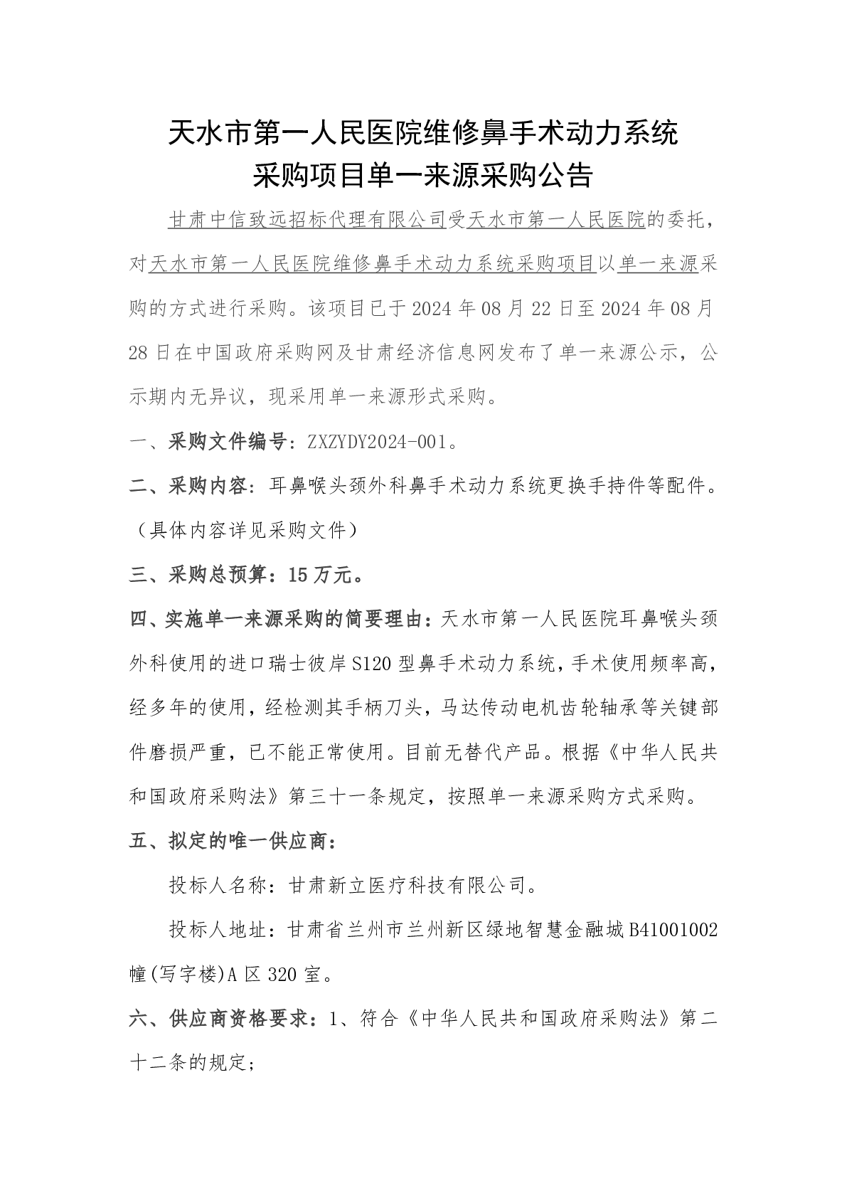 天水市第一人民醫(yī)院維修鼻手術(shù)動(dòng)力系統(tǒng)采購項(xiàng)目單一來源采購公告