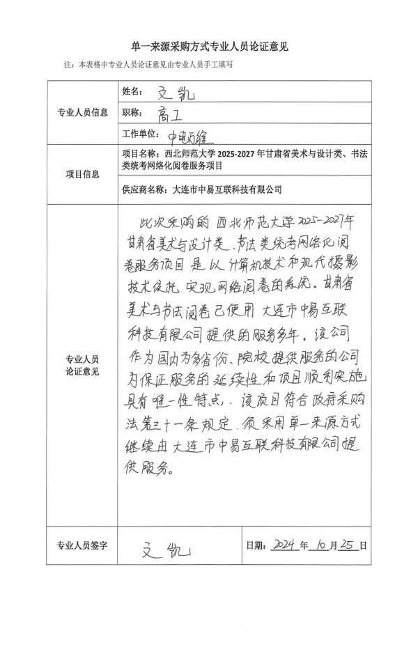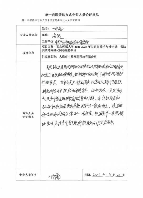 大連市中易互聯(lián)科技有限公司多年來(lái)為全國(guó)多個(gè)省份和高校提供美術(shù)與書法網(wǎng)絡(luò)化閱卷服務(wù),擁有多年閱卷服務(wù)的管理經(jīng)驗(yàn)。其項(xiàng)目管理團(tuán)隊(duì)穩(wěn)定高效、項(xiàng)目管理經(jīng)驗(yàn)豐富、閱卷流程理解清晰透徹。我省作為使用單位之一,使用這套網(wǎng)絡(luò)化閱卷解決方案多年,其提供的成熟完整的服務(wù)也得到了我省的肯定,對(duì)其使用效果表示滿意。鑒于以上原因,為保證該項(xiàng)目能順利進(jìn)行,根據(jù)《中華人民共和國(guó)政府采購(gòu)法》第三十一條、《中華人民共和國(guó)政府采購(gòu)法實(shí)施條例》第二十七條的規(guī)定,申請(qǐng)采取單一來(lái)源形式進(jìn)行采購(gòu)。