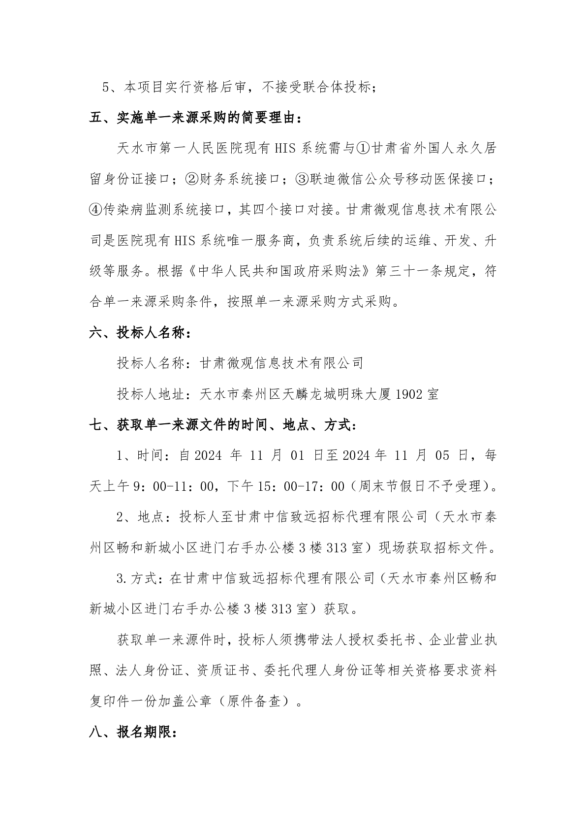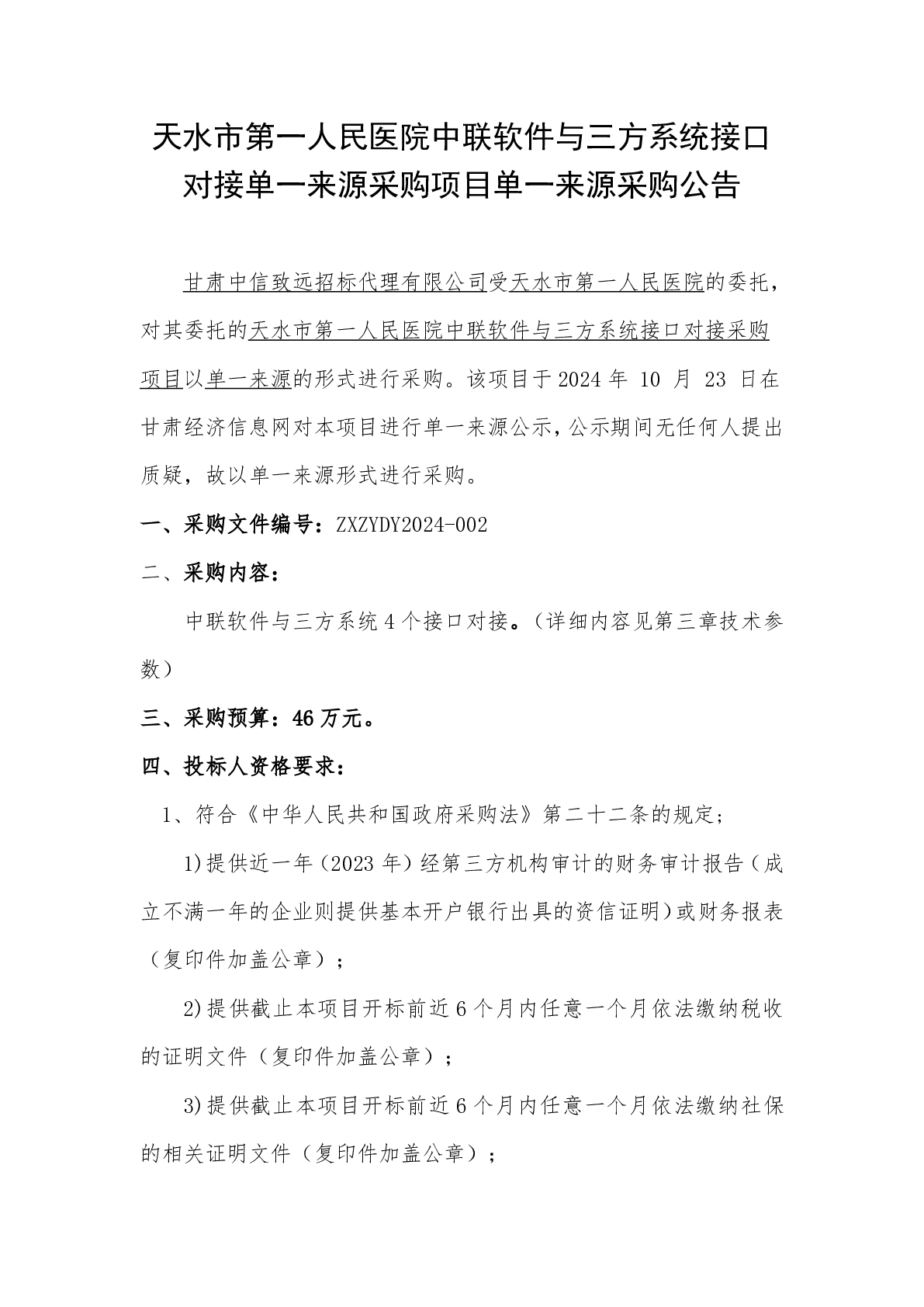 天水市第一人民醫(yī)院中聯(lián)軟件與三方系統(tǒng)接口對(duì)接單一來(lái)源采購(gòu)項(xiàng)目單一來(lái)源采購(gòu)公告