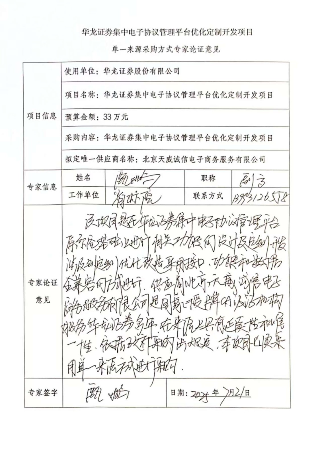 ? ? ?根據(jù)以上特點,我公司擬進行單一來源方式采購北京天威誠信電子商務(wù)服務(wù)有限公司對華龍證券集中電子協(xié)議管理平臺優(yōu)化定制,以進一步完善、提升華龍證券集中電子協(xié)議管理平臺產(chǎn)品使用和運營的能力。