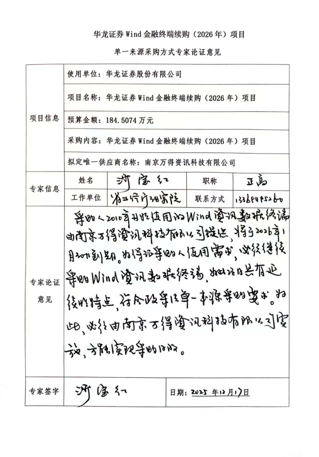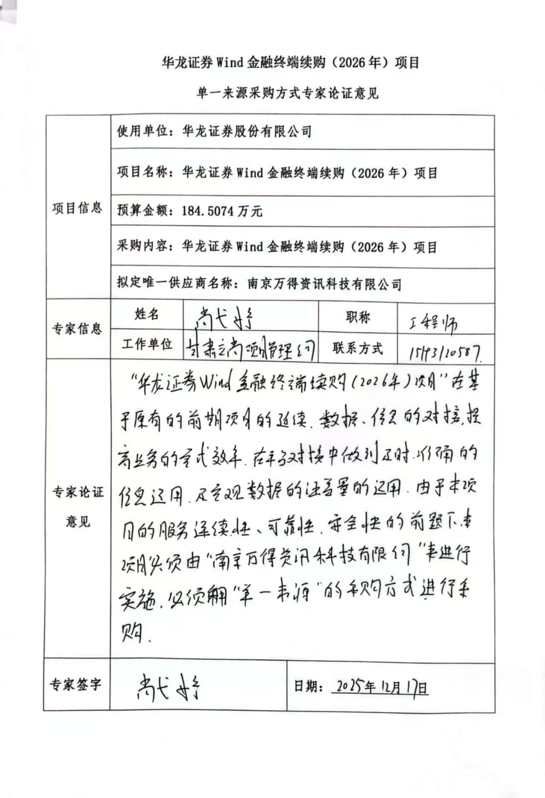 ? (六)擬定的唯一供應(yīng)商:南京萬得資訊科技有限公司