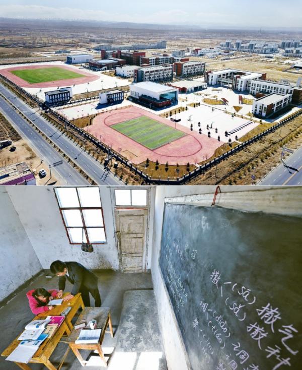 脫貧攻堅戰(zhàn)打響以來,甘肅省古浪縣對南部貧困山區(qū)的3個鄉(xiāng)和數(shù)十個行政村實施易地扶貧搬遷,整鄉(xiāng)整村搬遷至黃花灘生態(tài)移民區(qū),并完善水、電、路、氣、網(wǎng)和學校、醫(yī)院等公共服務(wù)設(shè)施,大力發(fā)展特色產(chǎn)業(yè),努力使群眾安居樂業(yè)。上圖為2020年3月10日拍攝的古浪縣黃花灘生態(tài)移民區(qū)綠洲生態(tài)移民小鎮(zhèn)的學校校園(無人機照片);下圖為2016年4月21日拍攝的古浪縣定寧鎮(zhèn)曉光村王家水小學教室舊貌。 新華社記者 范培珅/攝