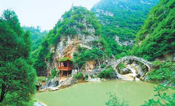 再走過一段山路,就來到著名的黃龍?zhí)?。此潭呈橢圓形,有四五十平方米大小,水深一米有余,潭水清澈,水草叢生,魚兒嬉戲,猶如一面大鏡子鑲嵌在峽谷之中。潭水呈黃色,相傳有黃龍自潭底飛出,因名黃龍?zhí)?。當然,傳說只是傳說,因為此地雨水較多,常常將沿途泥土沖刷裹挾至河流,河水由此變成黃色,在此回旋而得名。從空中看去,河流在魚竅峽來了個120度的轉彎,所以才會形成黃龍?zhí)哆@一緩沖的地方。