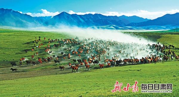 “胡馬,胡馬,遠放燕支山(即焉支山)下,跑沙跑雪獨嘶,東望西望路迷。迷路,迷路,邊草無窮日暮?!?nbsp;唐代詩人韋應物的一曲《調(diào)笑令·胡馬》,描繪了一幅雄偉壯麗的圖景:成群的駿馬放牧于焉支山下的大草原上,綿延的群山、無邊的草原、奔騰的駿馬,氣勢壯觀,境界闊大。這便是山丹馬場,地處祁連山冷龍嶺北麓的大馬營草灘(史稱漢陽大草灘),這里地域廣闊,土壤肥沃,水源充足,牧草豐盛,是天然的駐牧場所。