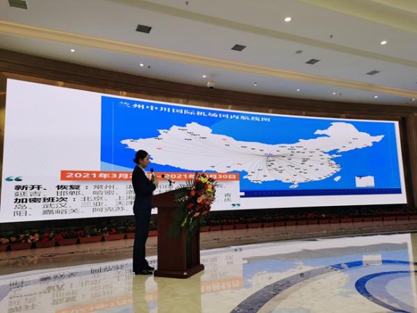 啟動儀式上,蘭州中川國際機場有關(guān)人員介紹2021年夏航季熱點航線航班。